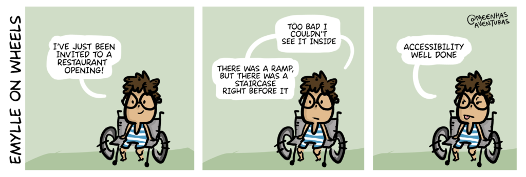 Emylle Torres Aguiar, is 22 and born in Fortaleza, Brazil. She finished a Tourism Course (2017), and is currently studying Spanish. She is a medalist and paralympic athlete of Boccia at a project called Esporte Sem Limites ("sport with no limits"), thought by the Associação D’Eficiência Superando Limites – (ADESUL). "Emylle On Wheels" is a webcomics work inspired by her life as a person with a disability. Through this work she’s become a character of the book series "Liz e seus Amigos" (Liz and the gang), a project by Associação Cearense de Beisebol and Daniel Brandão, a Brazilian comics artist.